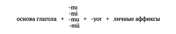 Настоящее время в турецком языке образуется с помощью аффикса -yor, который присоединяется к основе глагола. Аффиксу настоящего времени -yor могут предшествовать только гласные ı, i u, ü. Настоящее длительное время на -yor строится по следующей схеме (обратите внимание как аффикс -yor может изменяться):
