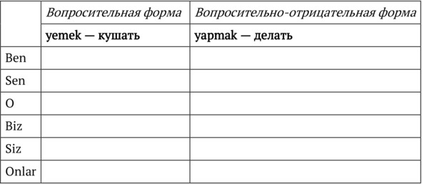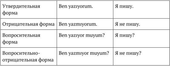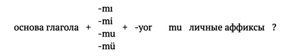 В образовании вопросительной формы участвует вопросительная частица -mı / -mi / -mu / -mü (Глава 2). Однако так как в настоящем времени используется аффикс -yor, то по закону гармонии гласных после него использоваться может только частица -mu (исключение составляет 3-е лицо мн. ч. – onlar (подробнее об этом ниже). Вопросительная частица соединяется с личным аффиксом и пишется отдельно от глагола, поставленного в форму настоящего времени:
