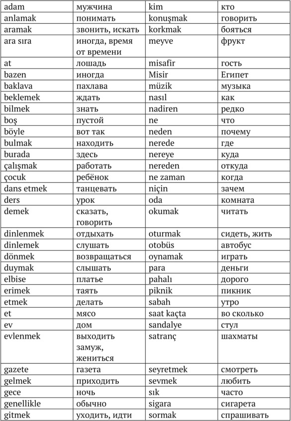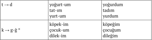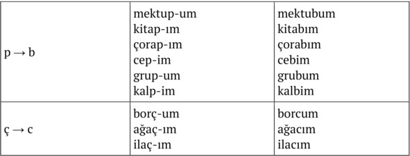 Если слово в турецком языке оканчивается на глухой согласный p / ç / t / к, при присоединении аффиксов, который начинается на гласную, глухой согласный изменяется на соответствующий звонкий. Помните, что правило распространяется лишь на некоторые слова (самые распространённые указаны в таблице).