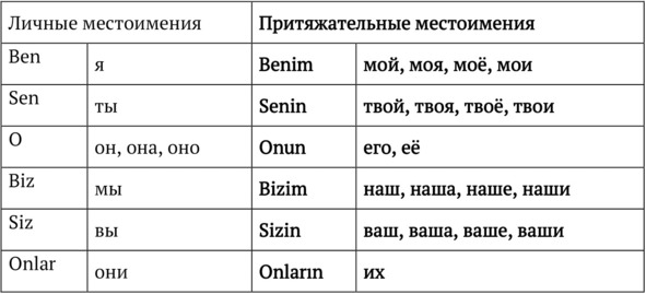 Личные притяжательные места обнаружения раскрывают раскрытие предмета, объекта к кому-либо. Их необходимо выучить, они легко накапливаются и запоминаются. Вы уже знаете, что в турецком языке отсутствует категория вида, поэтому перевод таких местоимений зависит от контекста.