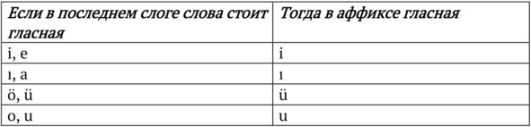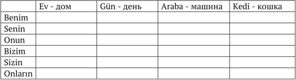 Тема притяжательных аффиксов хорошо позволяет довести до автоматизма применение закона гармонии гласных на турецком языке. В таблице ниже, обратите внимание, иногда встречается несколько аффиксов (например, Benim -ım / -im / -um / -üm), так вот: выбор гласной в аффиксе подчиняется закону гармонии гласных: