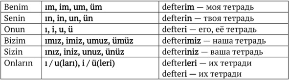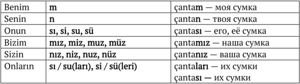 На турецком языке для указаний принадлежностей предмета кому-то редко используются одних лишь притяжательных местоимений. К слову, к принадлежащим относится притяжательное местоимение, обязательно прибавляется ещё и притяжательный аффикс.