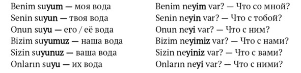 ИСКЛЮЧЕНИЯ – Su и Ne. Слова Su (вода) и Ne (что), несмотря на то что заканчиваются на гласную, склоняются иначе! Перед притяжательным аффиксом ставится прокладочная -y: