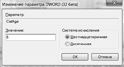Будет создан новый параметр типа DWORD под именем Новый параметр #1, готовый к редактированию. Напечатайте какое-нибудь имя, например CatAge, и нажмите клавишу Enter. Теперь необходимо присвоить значение этому параметру. Дважды щелкаем по параметру CatAge и вводим в текстовом поле Значение число 8 (рис. 1.12). Обратите внимание, что можно вводить как десятичное значение, так и шестнадцатеричное.