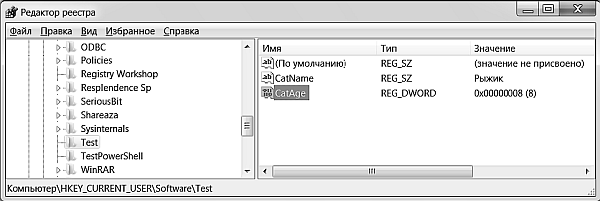 Итак, в результате наших действий в разделе Test появилось два новых параметра, CatName и CatAge, с установленными значениями, которые указывают имя кота и его возраст (рис. 1.13).