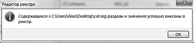 Откройте меню Файл ► Импорт… и в диалоговом окне найдите файл cat.reg, который был экспортирован в предыдущем примере. В результате появится окно с сообщением, что содержащиеся в файле настройки раздела и параметры успешно добавлены в реестр (рис. 1.16). В этом можно убедиться. Если сразу не видно никаких изменений, то попробуйте нажать клавишу F5 или выбрать меню Вид ► Обновить.