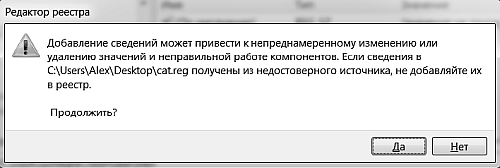 Для того чтобы импортировать REG-файл в реестр, можно просто сделать на нем двойной щелчок мышью. Например, когда мы сделали двойной щелчок мышью на файле cat.reg, который незадолго до этого был выгружен из реестра на Рабочий стол, система вывела предупреждение как на рис. 1.17.