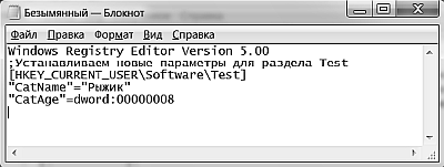 Писать REG-файл можно в любом текстовом редакторе, например в Блокноте. Создайте новый текстовый документ, наберите приведенный выше код (рис. 1.19) и сохраните файл с расширением REG.