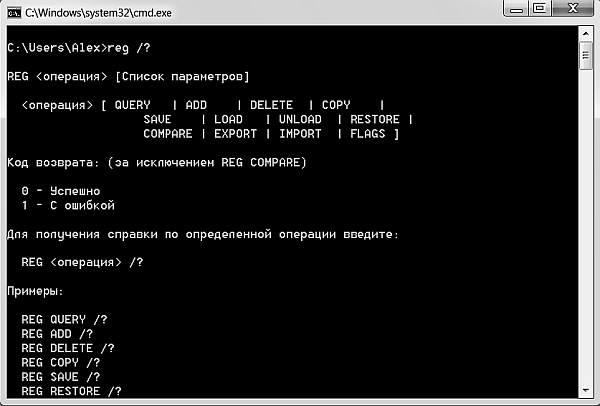 Рис. 1.21. Получение справки об операциях утилиты REG EXE