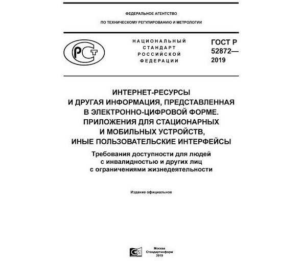 Полное название: ГОСТ Р 52872—2019 «ИНТЕРНЕТ-РЕСУРСЫ И ДРУГАЯ ИНФОРМАЦИЯ, ПРЕДСТАВЛЕННАЯ В ЭЛЕКТРОННО-ЦИФРОВОЙ ФОРМЕ. ПРИЛОЖЕНИЯ ДЛЯ СТАЦИОНАРНЫХ И МОБИЛЬНЫХ УСТРОЙСТВ, ИНЫЕ ПОЛЬЗОВАТЕЛЬСКИЕ ИНТЕРФЕЙСЫ. Требования доступности для людей с инвалидностью и других лиц с ограничениями жизнедеятельности».
