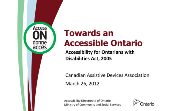 AODA распространяется на все организации, зарегистрированные в Онтарио, и устанавливает стандарты доступности в пяти областях: обслуживание клиентов, занятость, информация и коммуникации, транспорт и общественные места.