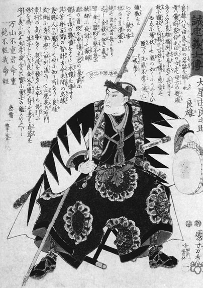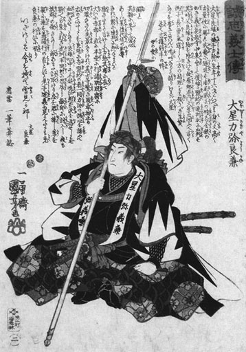 Утагава Куниёси. Обоси Юраносукэ Ёсио, сидящий на раскладном стуле, держа в руках барабан с палочкой и поддерживая плечом копье. XIX в.