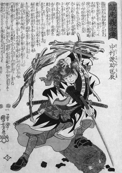Утагава Куниёси. Накамура Кансукэ Тадатоки, отражающий летящие в него связки дров, упирается ногой в блок из древесного угля. XIX в.