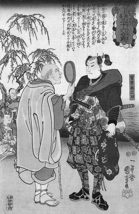 Утагава Куниёси. Мужчина, разглядывающий через лупу знаменитого фехтовальщика Миямото Мусаси. XIX в.