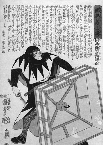 Утагава Куниёси. Окадзима Ясуэмон Цунэтацу, защищающийся с помощью деревянного каркаса от жаровни. XIX в.