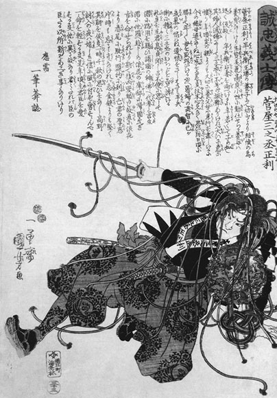 Утагава Куниёси. Сугэноя Саннодхё Масатоси падает, пытаясь перерубить мечом кисти кусудама, опутавшие его. XIX в.