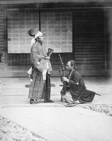 Самурай на коленях перед государственным чиновником, или дайме. Фото. 1877