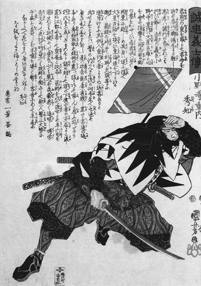 Утагава Куниёси. Онодэра Дзюнай Хидэтомо, присев с мечом в руке, пристально вглядывается вдаль. XIX в.