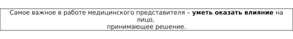 Самое важное в работе медицинского представителя – уметь оказать влияние на лицо, принимающее решение, – в данном случае мы говорим о враче. Оказать влияние – означает в первую очередь стать экспертом, имеющим возможность изменить отношение врача к препарату, проблеме, подходу к лечению и т. п.