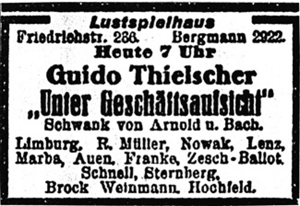 An diesem Hause hat Renate Müller am 21. Dezember 1927 ihre nächste Premiere: Unter Geschäftsaufsicht heißt der Schwank von Franz Arnold und Ernst Bach, der eigens für das Zugpferd des Theaters, den Komiker Guido Thielscher, geschrieben wurde.