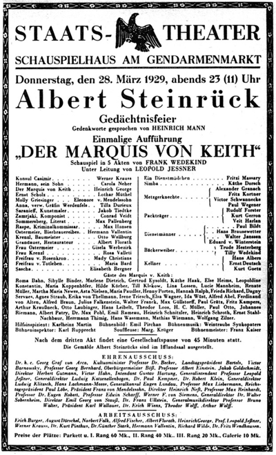 Renates erster bedeutender Bühnenauftritt unter Jessner ist gleichzeitig auch ein Stück Theatergeschichte. Für den am 11. Februar 1929 verstorbenen Schauspieler und Maler Albert Steinrück gibt das Staatstheater am Gendarmenmarkt eine Gedächtnisvorstellung von Wedekinds Der Marquis von Keith. Steinrück hatte sein Leben lang aus dem Vollen gelebt und so wenig an den Tod gedacht, dass nun das Geld für seine Beerdigung fehlt. Daraufhin setzt die Bühnengenossenschaft eine Benefiz-Veranstaltung an.
