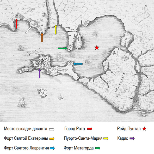 Хотя морские военачальники провели два или три военных совета после того, как флот покинул Ла-Манш, похоже, до сих пор не было составлено определенного плана действий. Несомненно, лидеры союзников были в полном неведении не только относительно положения дел на берегу и о состоянии гарнизона и укреплений, но и относительно естественной формы берега, на который они собирались сделать попытку высадки десанта. И все это, несмотря на то, что в 1587, 1596 и 1625 годах состоялись великие английские морские экспедиции против Кадиса, и что нынешний рейд готовился много месяцев.