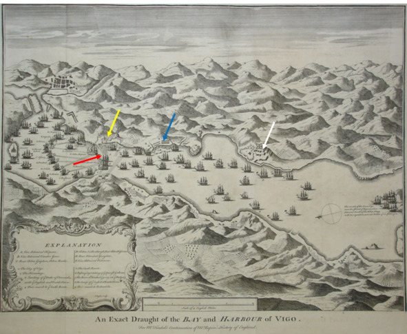 Залив Виго. Гравюра 18 века. Белая стрелка – Виго, синяя стрелка – место высадки десанта, желтая стрелка – форт Ранде, красная стрелка – заграждение поперек бухты.