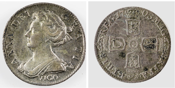 Монета в 6 пенсов, выпущенная в 1703 году в честь победы в заливе Виго