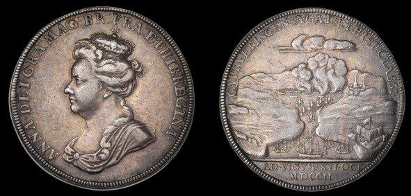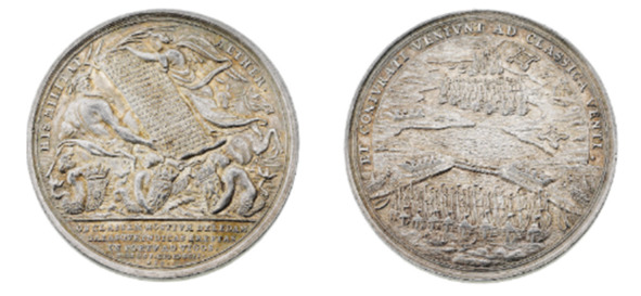 Серебряная медаль, выпущенная в честь победы в заливе Виго 23 октября 1702 года.