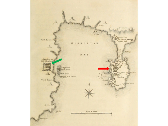 Гибралтар (красная стрелка), Альхесирас (зеленая стрелка)