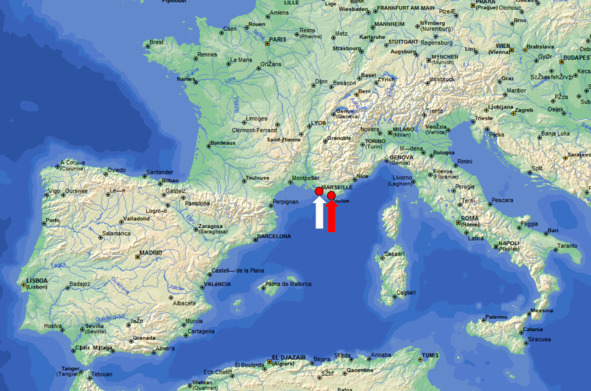 Тулон (красная стрелка), Марсель (белая стрелка)