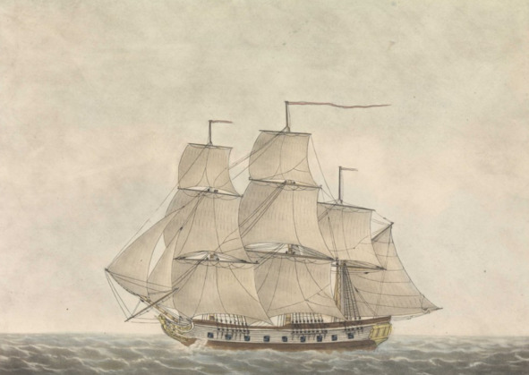 Британский малый фрегат конца XVIII века. Раскрашенная гравюра художника Томаса Баттерсворта (1768—1842)