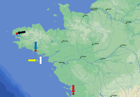 Остров Бель-Иль (желтая стрелка), Брест (черная стрелка), Лорьян (синяя стрелка), залив Киберон (белая стрелка), Рошфор (красная стрелка)