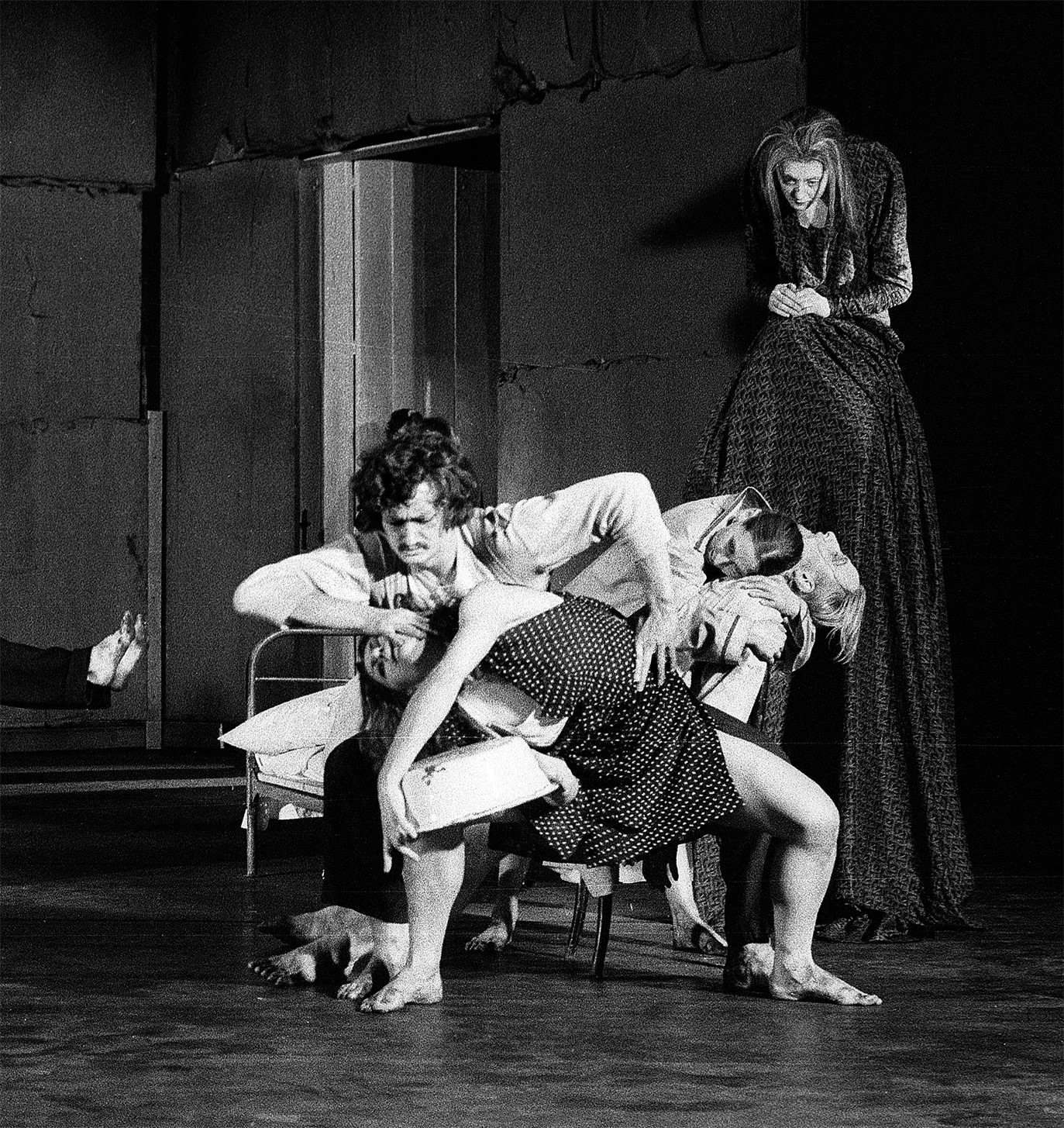 Через год после «Nachnull» в «Акции для танцовщиков» («Aktionen für Tänzer», 1971) она перевела на язык сцены термин «акция» (хеппенинг/перформанс) из композиции Гюнтера Беккера. Он использовался не только в политике, но и в искусстве и в театре как антитеза буржуазному театру представления[41]. В ассоциативно-сатирической хореографии она безошибочно дает понять, что отказ от традиционных форм сценического танца необратим, и начинает ставить под сомнение сценический танец как театральное событие. В постановке женщина в рубашке неподвижно лежит на больничной койке, вся труппа забирается на кровать и играет в жуткие игры с безжизненным телом. Его перекатывают по сцене, натягивают на шкив и подвешивают под потолком.