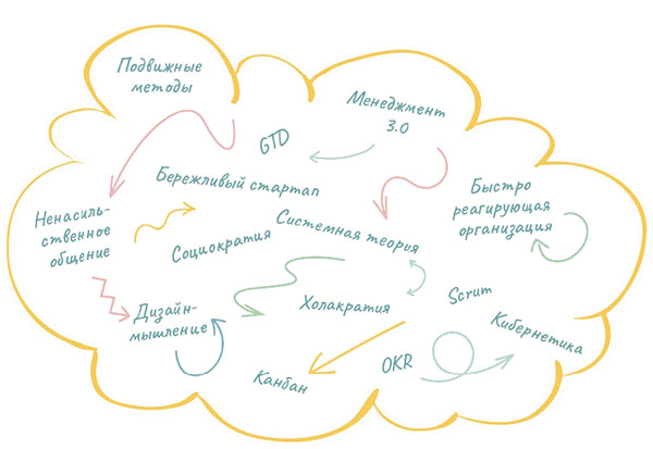 Если вы хорошо подкованы в вопросах организационного развития, то, скорее всего, вас уже интересует вопрос, какие термины мы намерены использовать для описания организации будущего. Существует множество предложений относительно ее названия. Фредерик Лалу называет ее «бирюзовой». Кто-то предлагает называть ее «гибкой» или «самоорганизующейся». В книге «О дивный новый труд» (Brave New Work) организации будущего носят название «эволюционных». Кто-то просто говорит об организациях «нового типа» или «нового уровня». Возможно, у вас уже голова идет кругом. Но для нас не имеет значения, как называть организацию будущего, так как поиск единственно правильного обозначения какого-то явления является признаком старой командной системы. Циклический подход выдвигает на первый план процесс, а не результат, потому что любая трансформация дает в итоге разные результаты. Поэтому мы избегаем названий, а если вы в процессе чтения будете все-таки натыкаться на разные ярлыки, не удивляйтесь: все они в сущности означают одно и то же.