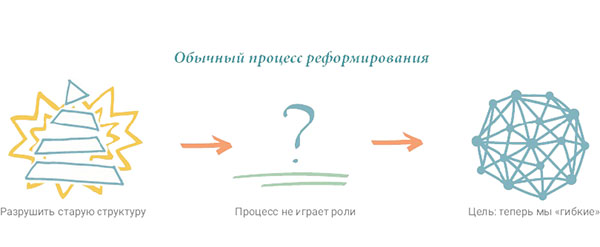 Простого ответа на этот вопрос до сих пор не существует. Чтобы трансформация оказалась удачной, требуется не только новая оболочка, но и смена образа мышления. Для классической иерархии менеджмента характерны административно-командный и прогностический подходы. Это означает, что иерархическая верхушка разрабатывает планы, которые реализуются на нижних уровнях пирамиды, а также контролирует ход исполнения посредством промежуточных управленческих структур.