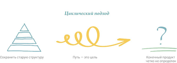 Наш циклический подход помогает организациям трансформироваться собственными силами. Он отвечает не столько на вопрос «Что?» (получится в конце), сколько на вопрос «Как?» (мы туда доберемся). Очень часто предприятиям хочется хоть одним глазком глянуть в направлении «Что?»: они рисуют схемы, организовывают гильдии, формируют команды во главе со Scrum-мастерами. Но ключ к успеху лежит в ответе на вопрос «Как?», и для этого мы предлагаем несколько новых полезных инструментов.