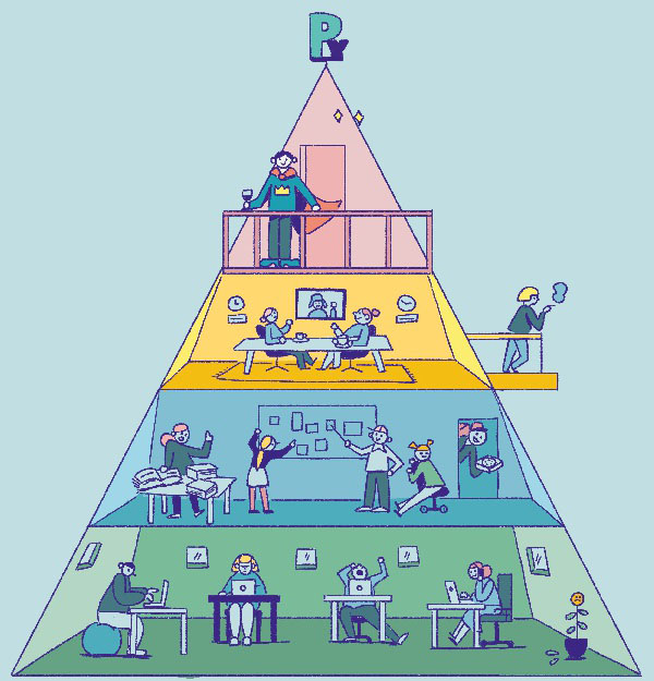 Данный организационный принцип проходит через всю историю человечества. Каждый раз, когда нужно было организовать большую массу людей ради общей цели или в интересах какой-то могущественной персоны, обращались, как правило, к пирамиде. Особенно это касается предприятий. И неудивительно: классическая иерархия устраняет из системы всю сложность. Она обеспечивает ясность. В ней каждый знает, что ему надо делать. Крупные задачи можно прекрасно распределить по отдельным подразделениям организации.