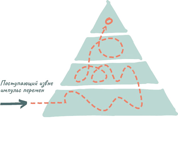 Зафиксировав изменения, этот датчик в старой пирамидальной системе должен донести информацию по инстанциям до самого верха, где принимаются решения. Но к тому моменту, когда она туда попадает, проходят недели, месяцы, а иногда и годы. И даже если импульс перемен доходит до цели, то принятое решение должно вновь спуститься по инстанциям до самого низа, прежде чем в деятельности предприятия что-то действительно поменяется. Это не идет на пользу ни организации, ни людям, которые в ней работают.