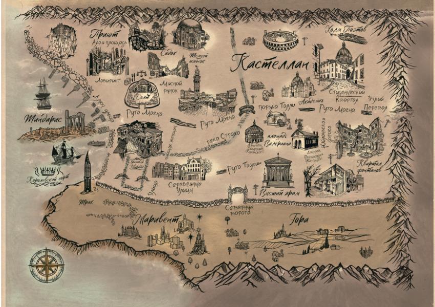 Дорога вела вверх по склону, поросшему лавандой, шалфеем и душистой зубровкой. Летом гора была темно-зеленой. Когда могучий конь, тяжело дыша, добрался до вершины горы, Кел взглянул вниз, на раскинувшийся перед ним Кастеллан: полумесяц порта, огни кораблей на темной воде, похожие на разбросанные горящие спички. Каналы Храмового квартала. Аккуратные линии Серебряных улиц. Белый купол Талли, светящиеся часы на верхушке Ветряной башни, над самой большой площадью города. Обнесенный стеной Солт, где жили люди народа ашкаров. Дорогу Рута Магна, которая разрезала город, подобно шраму, полученному на дуэли.