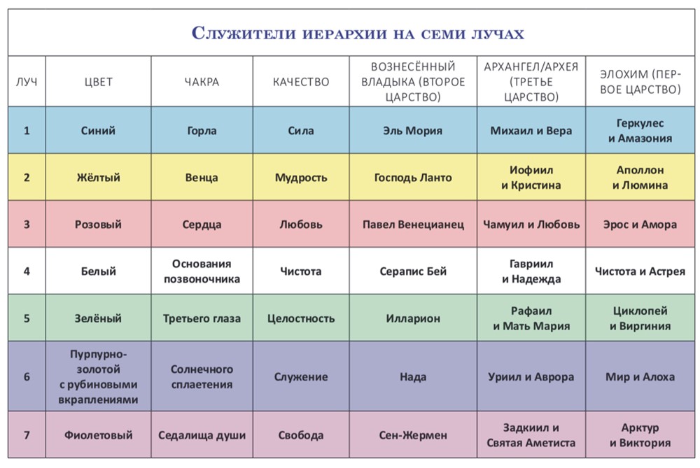 Таблица «Служители иерархии на семи лучах» (см. следующий раздел) содержит имена иерархов, служащих на семи лучах в каждом из трёх царств. В первых четырёх колонках представлена основная информация о семи лучах. В пятой перечислены имена семи чоханов лучей. А в шестой приведены имена семи архангелов, работающих на каждом из лучей, а также их близнецовых пламён, или женских дополнений, называемых «археями». Последняя колонка содержит имена семи могущественных Элохим и их Божественных дополнений.