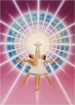 После того как было сформировано каузальное тело, близнецовые пламена, перед тем как сойти в материю, разделились на две идентичные сферы как полярности Альфы и Омеги.