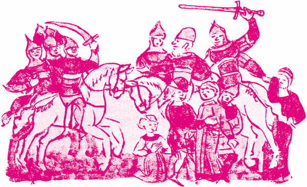 Войска Андрея Боголюбского, после взятия приступом и разграбления Киева, уводят из города пленных.