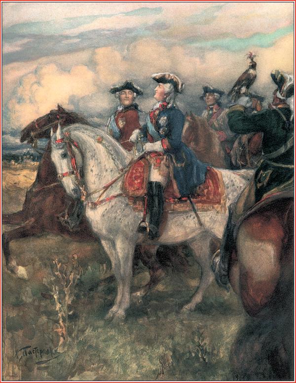 ВЫЕЗД ИМПЕРАТРИЦЫ ЕКАТЕРИНЫ II В МУНДИРЕ КОННОЙ ГВАРДИИ НА ОХОТУ 3 °CЕНТЯБРЯ 1767 ГОДА.