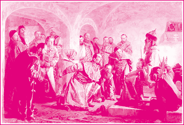 Возвращение царя. В слободу отправилась депутация из высшего духовенства, бояр и приказных людей с архиепископом Новгородским Пименом во главе, сопровождаемая многими купцами и другими людьми, которые шли бить челом государю и плакаться, чтобы государь правил, как ему угодно, по всей своей государской воле. Царь принял земское челобитье, согласился воротиться на царство, «паки взять свои государства», но на условиях, которые обещал объявить после. Через несколько времени, в феврале 1565 г., царь торжественно воротился в столицу и созвал Государственный совет из бояр и высшего духовенства. Его здесь не узнали: небольшие серые проницательные глаза погасли, всегда оживленное и приветливое лицо осунулось и высматривало нелюдимо, на голове и в бороде от прежних волос уцелели только остатки. Очевидно, два месяца отсутствия царь провел в страшном душевном состоянии, не зная, чем кончится его затея. В совете он предложил условия, на которых принимал обратно брошенную им власть. Условия эти состояли в том, чтобы ему на изменников своих и ослушников опалы класть, а иных и казнить, имущество их брать на себя в казну, чтобы духовенство, бояре и приказные люди все это положили на его государевой воле, ему в том не мешали. Царь как будто выпросил себе у Государственного совета полицейскую диктатуру – своеобразная форма договора государя с народом!