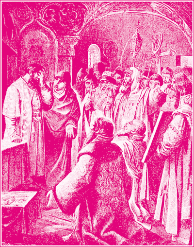 Царь Феодор Иоаннович оповещает митрополита и бояр о кончине отца.