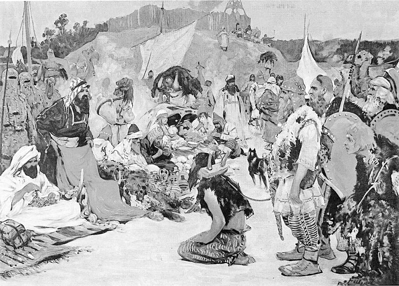 Одно внешнее обстоятельство особенно содействовало успехам этой торговли. С конца VII в. по южнорусским степям стала распространяться новая азиатская орда, Хозары. Это было кочевое племя тюркского происхождения; но оно не было похоже на предшествовавшие ему и следовавшие за ним азиатские орды, преемственно господствовавшие в южнорусских степях. Хозары скоро стали покидать кочевой быт и обращаться к мирным промыслам. В VIII в. среди них водворились из Закавказья промышленные Евреи и Арабы. Еврейское влияние здесь было так сильно, что династия хозарских каганов со своим двором, т. е. высшим классом хозарского общества, приняла иудейство. Раскинувшись на привольных степях по берегам Волги и Дона, Хозары основали средоточие своего государства в низовьях Волги. Здесь столица их Итиль скоро стала огромным разноязычным торжищем, где рядом жили могометане, евреи, христиане и язычники. Хозары покорили племена восточных Славян, живших близко к степям, Северян, Вятичей. Но хозарское иго доставляло покоренным большие экономические выгоды. С тех пор для них, как данников Хозар, были открыты степные и речные дороги, которые вели к черноморским и каспийским рынкам. Под покровительством Хозар по этим рекам пошла бойкая торговля из Поднепровья. Мы встречаем ряд указаний на успехи этой торговли. Арабский писатель Хордадбе, современник Рюрика и Аскольда, писавший не позже 870-х годов, замечает, что русские купцы возят товары из отдаленных краев своей страны к Черному морю в греческие города, где византийский император берет с них десятину (торговую пошлину), что те же купцы плавают по Волге, спускаются к хозарской столице, где властитель хозарский берет с них также десятину, выходят в Каспийское море, проникают на юго-восточные его берега и даже провозят свои товары на верблюдах до Богдада. Сколько поколений нужно было, чтобы проложить такие далекие и разносторонние торговые пути с берегов Днепра и Волхова! Восточная торговля Поднепровья, как ее описывает Хордадбе, могла завязаться по крайней мере лет за сто до этого арабского географа. Впрочем, есть и прямое указание на время, когда завязалась и развивалась эта торговля. В области Днепра найдено множество кладов с древними арабскими монетами, серебряными диргемами. Большая часть их относится к IX и X векам, ко времени наибольшего развития восточной торговли Руси. Но есть клады, в которых самые поздние монеты не позже начала IX века, а ранние восходят к началу VIII века; изредка попадаются монеты VII века и то лишь самых последних его лет. Эта нумизматическая летопись наглядно показывает, что именно в VIII веке завязалась торговля Славян днепровских с хозарским и арабским востоком. Но этот век был временем утверждения Хозар в южнорусских степях; ясно, что Хозары и были торговыми посредниками между этим востоком и русскими Славянами.