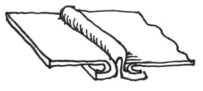 Стачной шов можно украсить кантиком (рис. 6). Детали складываются бахтармой, между ними вкладывается сложенный вдвое, бахтармой внутрь, кантик (рис. 7). Вдоль линии будущего шва с одной или обеих сторон укладываются полоски кожи шириной 3–4 мм. Сшиваются одновременно обе детали, кант и полоски, причем полоски не прошиваются насквозь, а прихватываются косыми стежками и приобретают вид витого шнура.