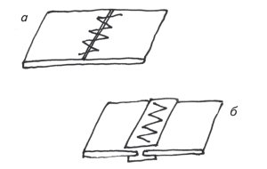 Шов встык. Выполняется «зигзагом». Применяется для соединения деталей, если требуется получить минимальную толщину шва (рис. 8а). Он может быть укреплен тесьмой или кожаной полоской снизу или сверху, а также с двух сторон (рис. 86).