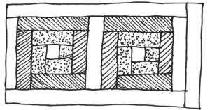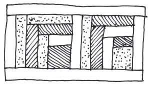 Шов встык применяют для набора (так называют полотно, собранное из небольших кусочков кожи). Набор можно использовать для шитья сумок, жилетов, чехлов на подушки и т. п. Набор бывает мозаичным, из кусочков различных форм и размеров, и регулярным (геометрическим), собранным из правильных геометрических фигур, составляющих раппорт рисунка. Это может быть «паркет», «елочка» (рис. 9), «американский квадрат» (рис. 10), «витраж» (рис. И).